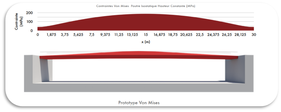 La conception d’un ouvrage d’art répond habituellement aux exigences techniques et fonctionnelles spécifiques d’un emplacement. La solution technique s’appuie souvent sur des cas antérieurs de succès (typiques tels que bipoutre, bow-string, Warren, TPE, etc.), tout en s’efforçant de répondre directement aux défis spécifiques du lieu. Le design paramétrique s’appuie sur une réponse méthodique aux conditions générales pour générer de nouveaux designs. En définissant les conditions de configuration et en sélectionnant minutieusement les éléments structuraux (conditions d’appui, revêtement, drainage, etc.), cette méthode permet d’optimiser la géométrie de la forme structurelle. Cette approche est utilisée pour concevoir des prototypes de ponts préconçus, en optimisant la structure et en adaptant la géométrie aux efforts internes. Les ponts préconçus Von Mises, élaborés à partir du critère de contrainte de Von Mises, automatisent le processus de conception en utilisant les efforts structuraux comme base géométrique.