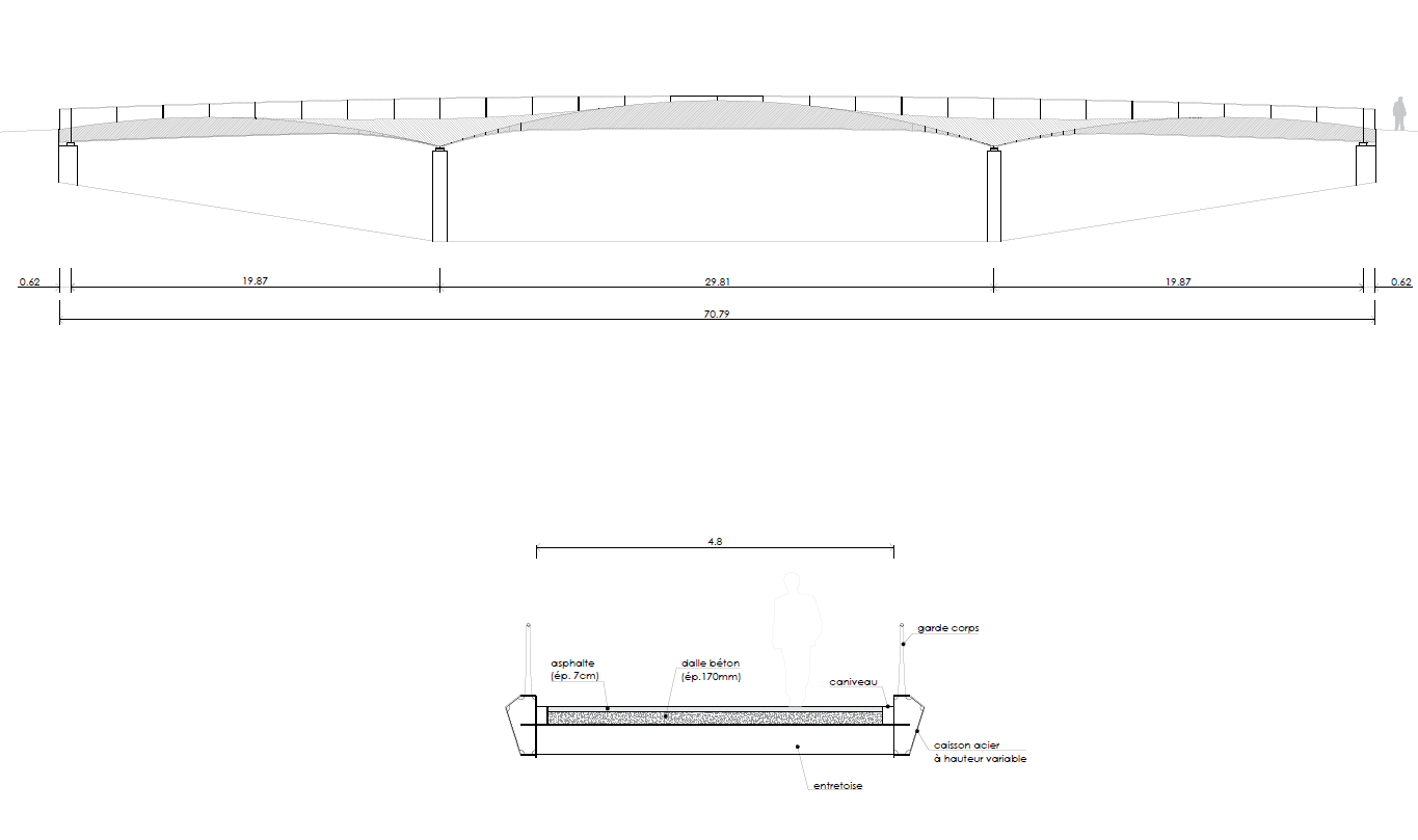 Passerelle à une portée de 26 mètres et une largeur de 2,5 mètres.