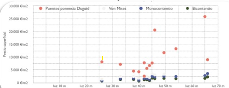 Le graphique suivant, produit par Mario Guisasola dans le cadre de sa thèse, reflète le prix par mètre carré des ponts analysés par Duguid et le prix de surface résultant de l’application d’un prototype Von Mises, Monocontentio ou Bicontentio.